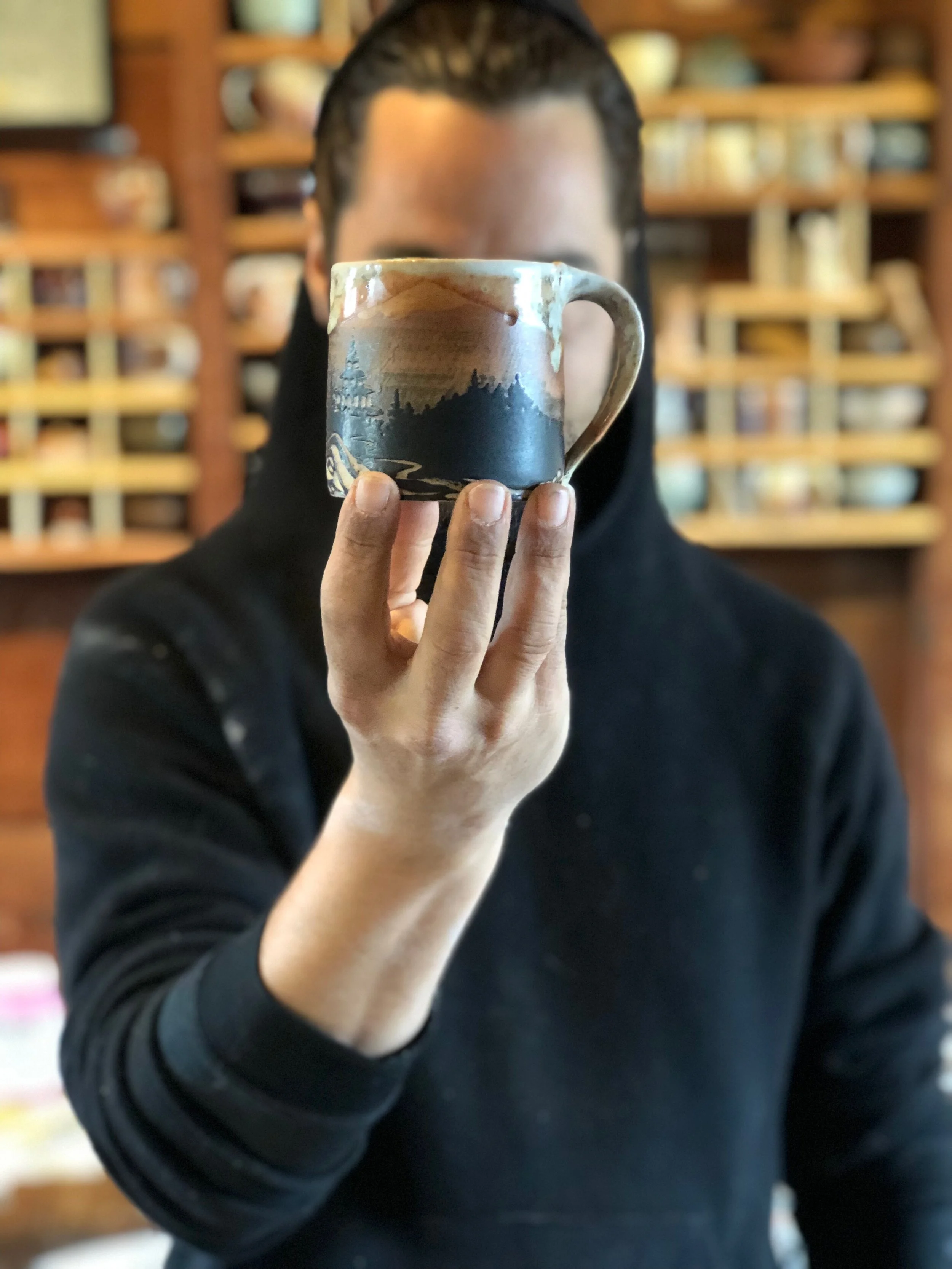 Jasper Marino pays homage to the physical and cultural landscape of Santa Cruz and the bay area in his work. One of his signature series of mugs and tumblers features hand painted silhouettes of redwood, fir, and live oak trees iconic to the central coast of California. Another one of his classic designs draws on techniques from calligraphy to carve away clay from the mug, bowl, or plate leaving intricate patterns that reflect a refined and organic aesthetic.